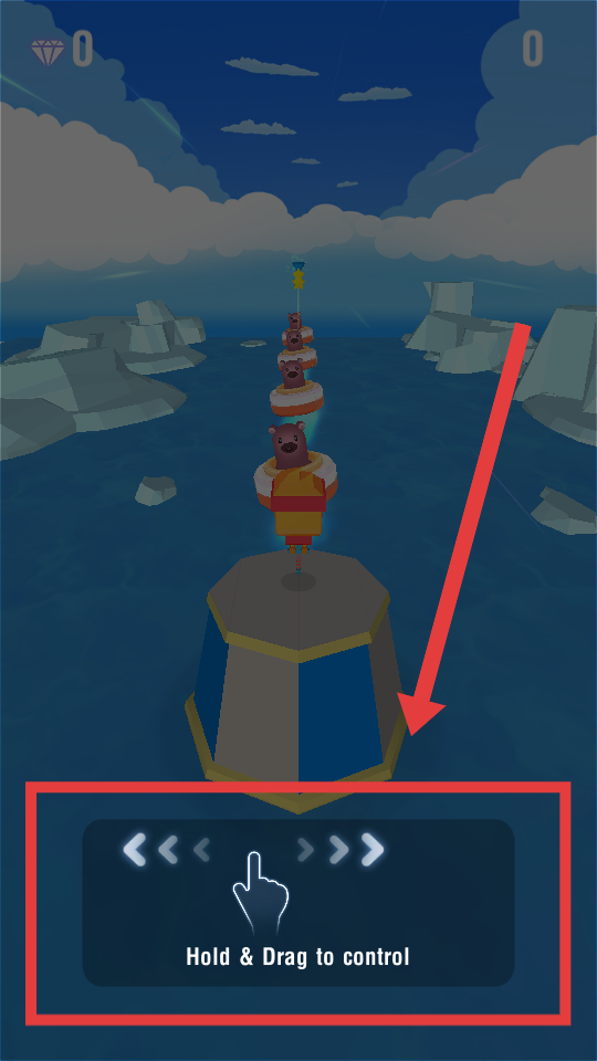 2、來到游戲場景面對水上的角色與平臺,按住下方控制區(qū)域拖動,調(diào)整角色移動方向與路徑。
