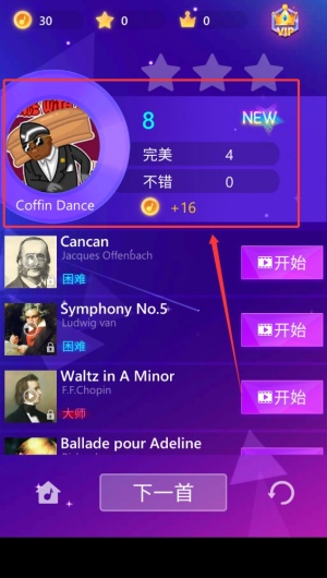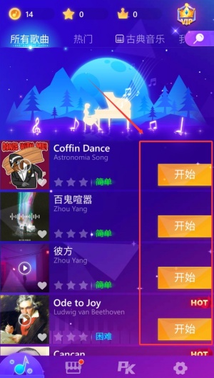 2、在音樂庫中滑動瀏覽各類曲目,點(diǎn)擊心儀歌曲的封面即可試聽,再次點(diǎn)擊"開始"鍵載入譜面。