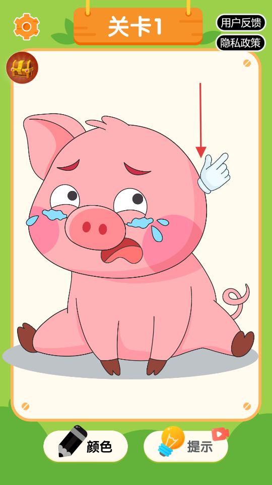 1、進(jìn)入關(guān)卡1,看到哭泣的粉色小豬,根據(jù)白色手掌指引,點(diǎn)擊小豬對(duì)應(yīng)位置,通過操作讓小豬情緒改變,完成關(guān)卡。