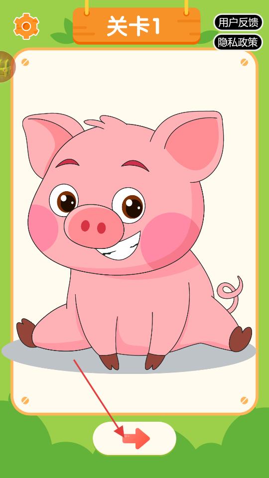 2、小豬情緒轉(zhuǎn)變后,界面下方出現(xiàn)紅色箭頭按鈕,點(diǎn)擊該按鈕,確認(rèn)關(guān)卡1完成,進(jìn)入關(guān)卡選擇過渡環(huán)節(jié)。