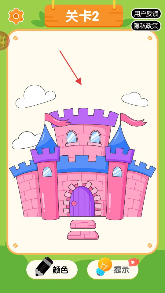 3、來到關(guān)卡2,呈現(xiàn)粉色城堡圖案,根據(jù)紅色箭頭指引,點(diǎn)擊城堡對(duì)應(yīng)區(qū)域,開始進(jìn)行關(guān)卡2的涂色或解謎操作。