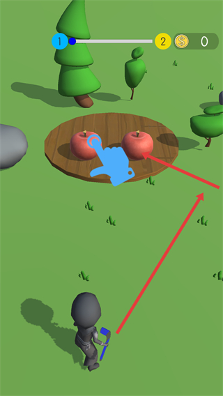 1、操控角色靠近擺有蘋果的木盤,準(zhǔn)備進(jìn)行蘋果切割操作,開啟本輪的首次挑戰(zhàn)。