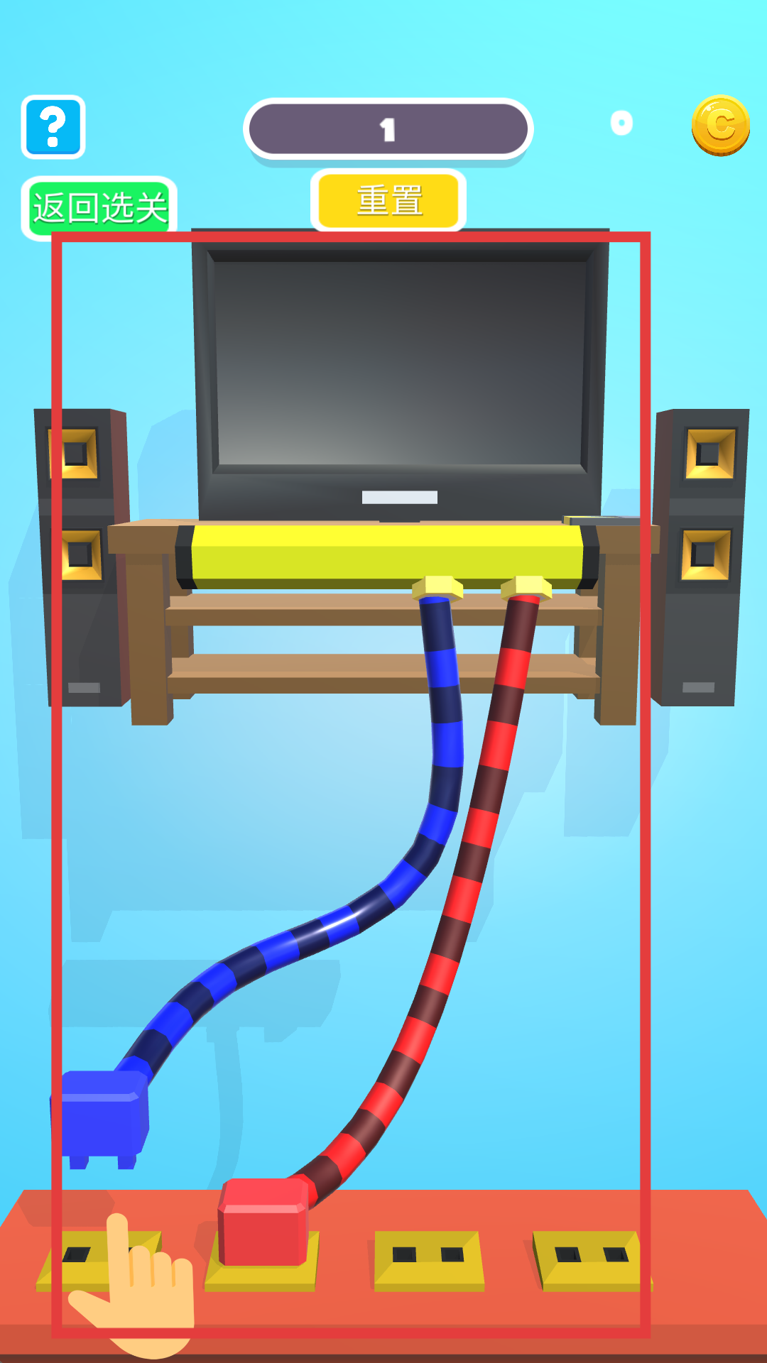 2、在關(guān)卡1游戲頁(yè)面,觀察紅藍(lán)管道及下方插座布局,根據(jù)指引,將交叉的管道插頭對(duì)應(yīng)放入插座,完成管道正確連接,觸發(fā)通關(guān)判定。