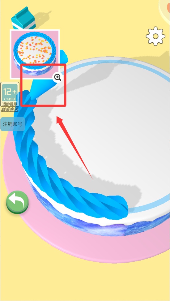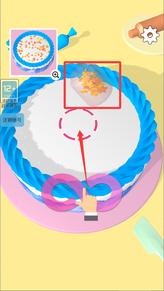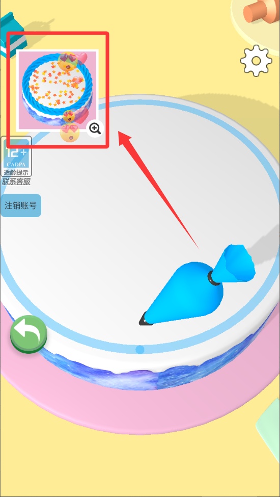 1、游戲界面左上角展示著已完成的標(biāo)準(zhǔn)蛋糕作品,玩家可以參考這個(gè)樣式進(jìn)行裝飾創(chuàng)作。