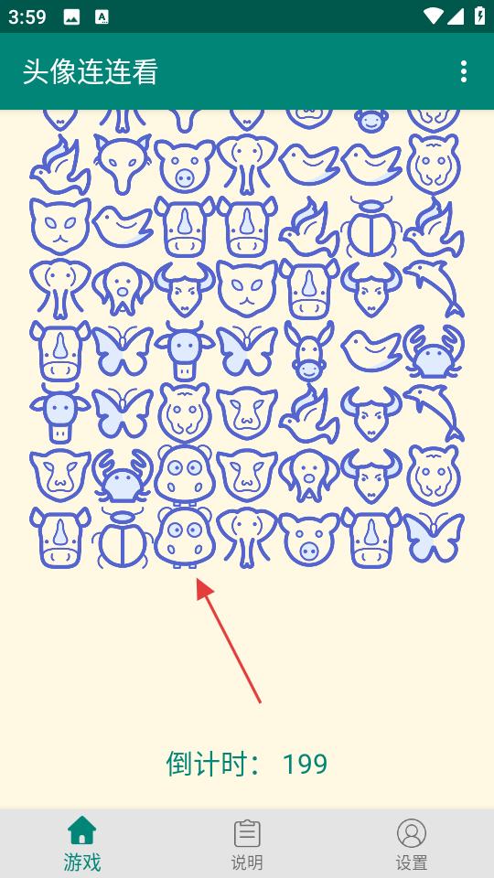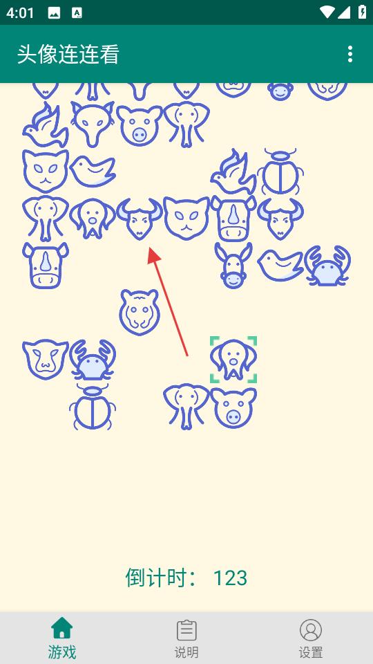 3、找到相同的動(dòng)物頭像后,依次點(diǎn)擊這兩個(gè)頭像,若連線符合規(guī)則,即可消除這對(duì)頭像,持續(xù)消除,直到完成關(guān)卡目標(biāo)或倒計(jì)時(shí)結(jié)束。