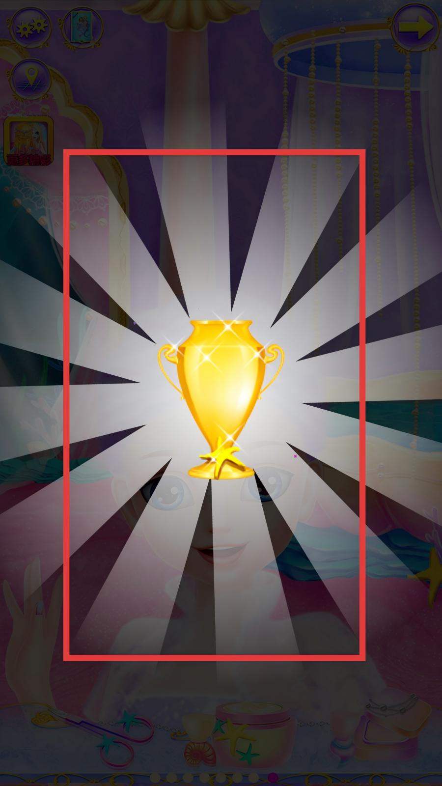 3、完成公主護(hù)理所有步驟后,觸發(fā)通關(guān)獎(jiǎng)勵(lì)動(dòng)畫(huà),屏幕顯示金色獎(jiǎng)杯,代表護(hù)理任務(wù)成功,隨后可返回海底地圖界面,選擇其他功能建筑繼續(xù)游戲。