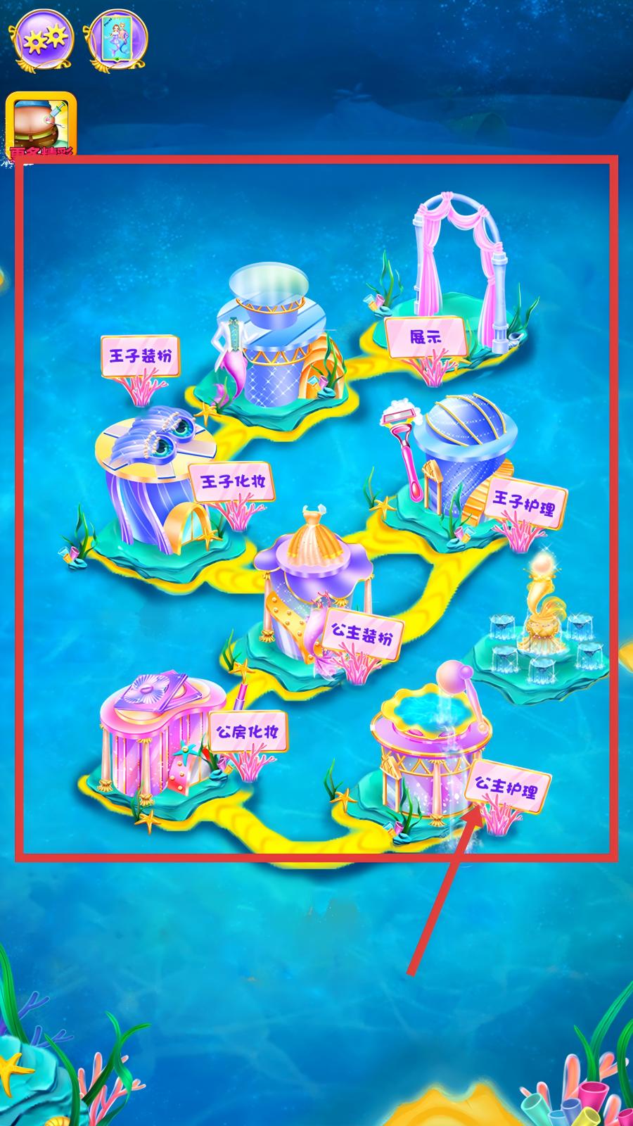 1、進(jìn)入美人魚(yú)時(shí)尚化妝的場(chǎng)景選擇界面,界面呈現(xiàn)海底主題地圖,分布王子裝扮、公主護(hù)理等多個(gè)功能建筑,點(diǎn)擊公主護(hù)理建筑,進(jìn)入公主護(hù)理場(chǎng)景。