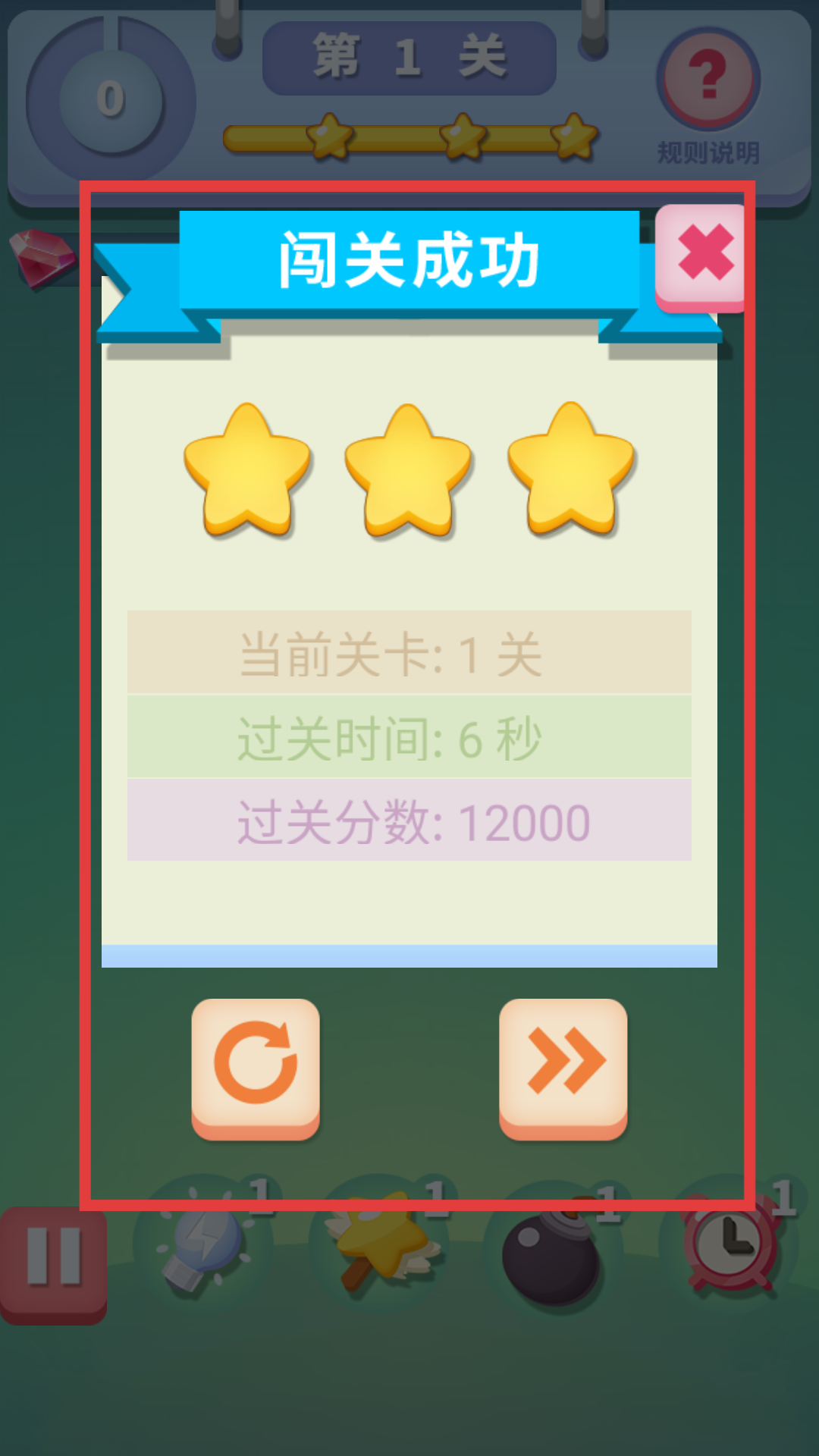 4、闖關(guān)成功后顯示詳細(xì)關(guān)卡數(shù)據(jù)及星級評價,點擊右側(cè)箭頭按鈕,進(jìn)入第2關(guān),點擊左側(cè)刷新按鈕,可重新挑戰(zhàn)本關(guān),繼續(xù)連連看游戲流程。