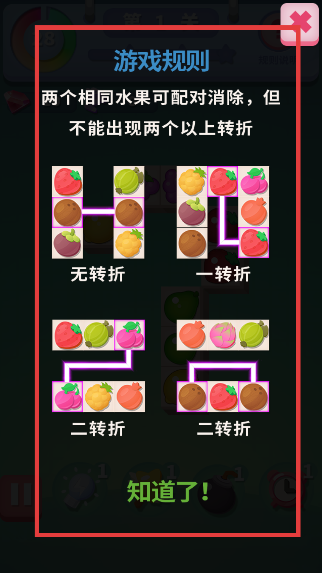 2、在游戲規(guī)則說明頁,規(guī)則為兩個相同水果可配對消除,且配對路徑轉(zhuǎn)折不能超兩次,確認(rèn)規(guī)則后點擊知道了進(jìn)入關(guān)卡。