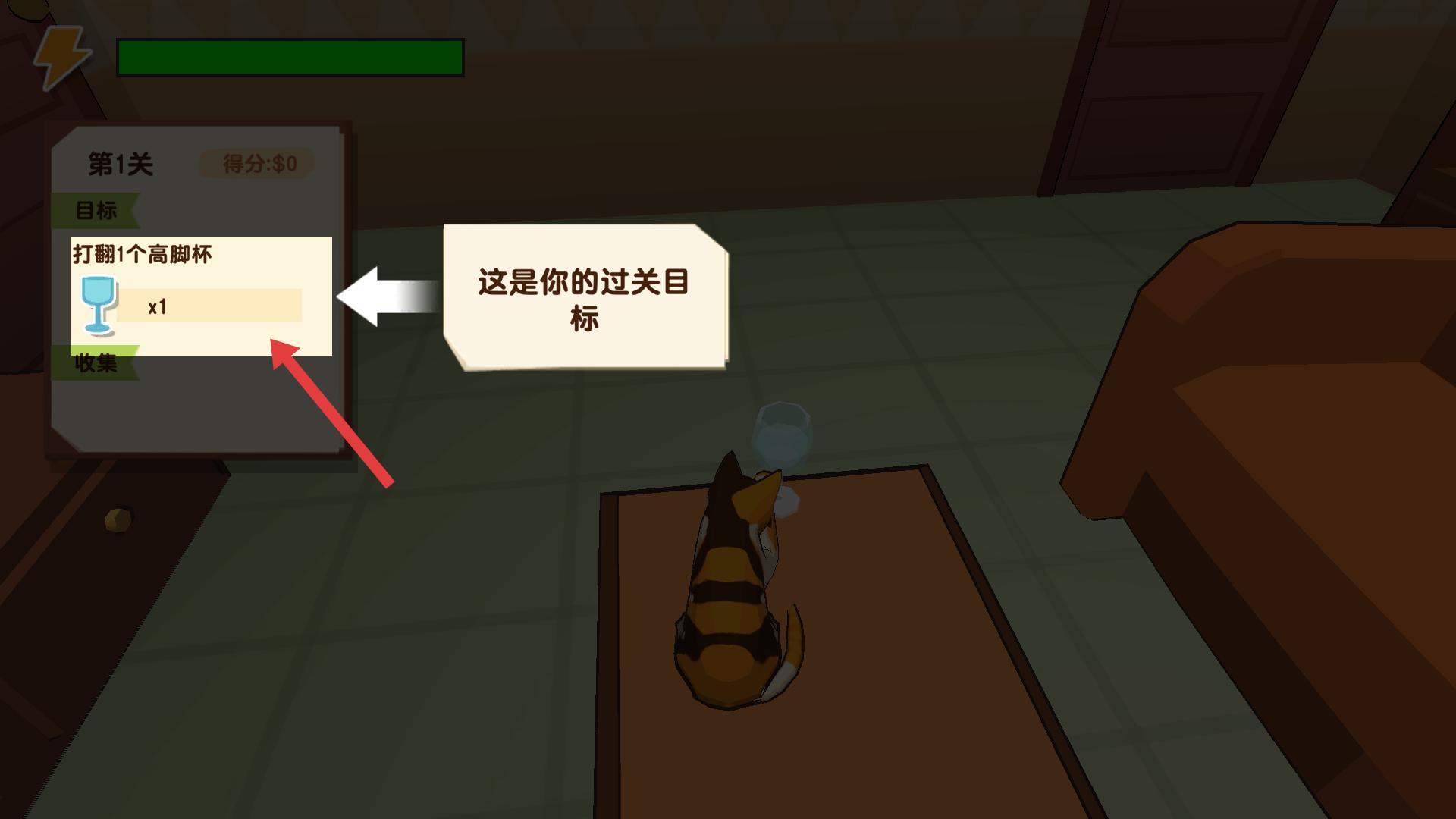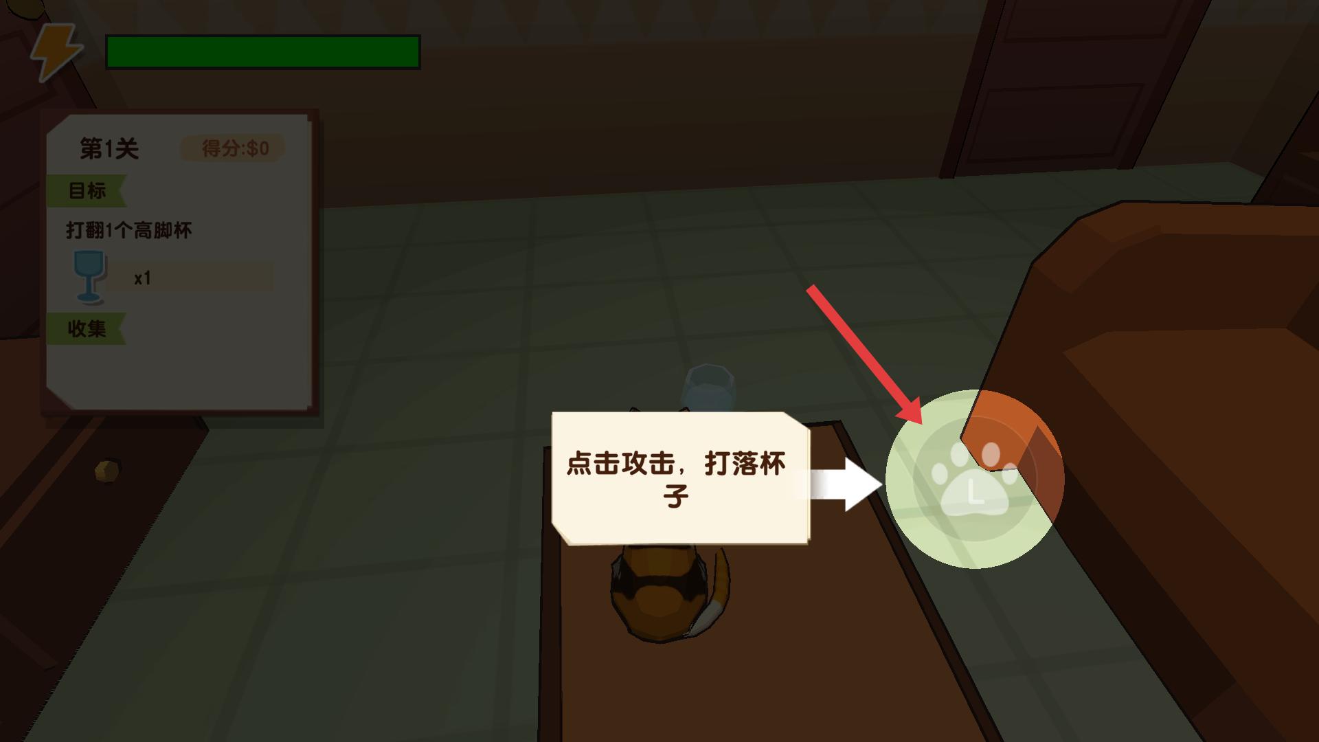 2、第一關(guān)開始,左側(cè)顯示目標(biāo)為打翻1個(gè)高腳杯,操控貓咪靠近目標(biāo)高腳杯,明確任務(wù)后規(guī)劃行動(dòng)路徑,準(zhǔn)備實(shí)施破壞操作。