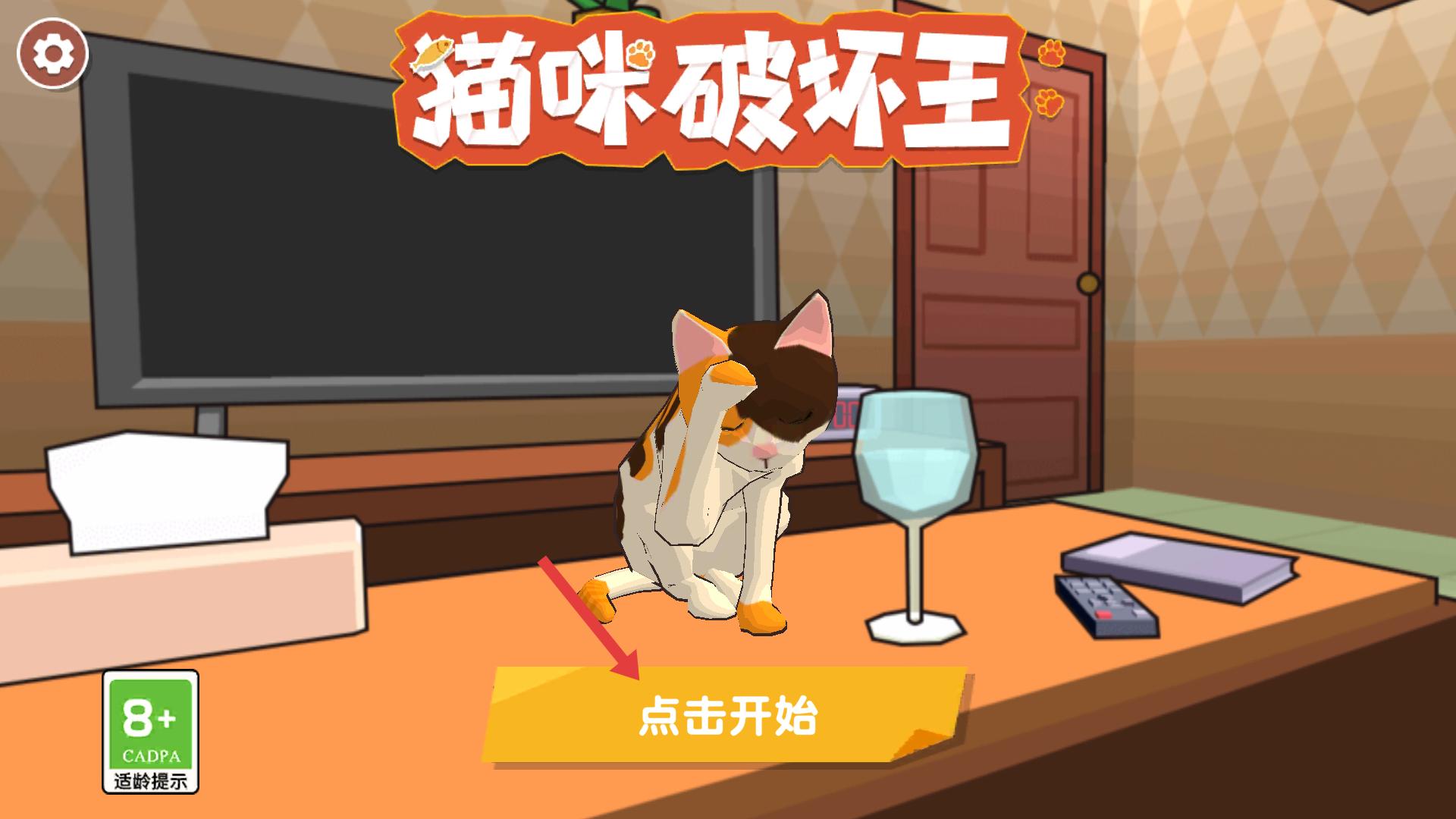 1、進(jìn)入游戲,點(diǎn)擊點(diǎn)擊開始按鈕,開啟貓咪破壞之旅,要留意畫面中各類物品,后續(xù)需操控貓咪完成破壞任務(wù),準(zhǔn)備迎接第一關(guān)挑戰(zhàn)。
