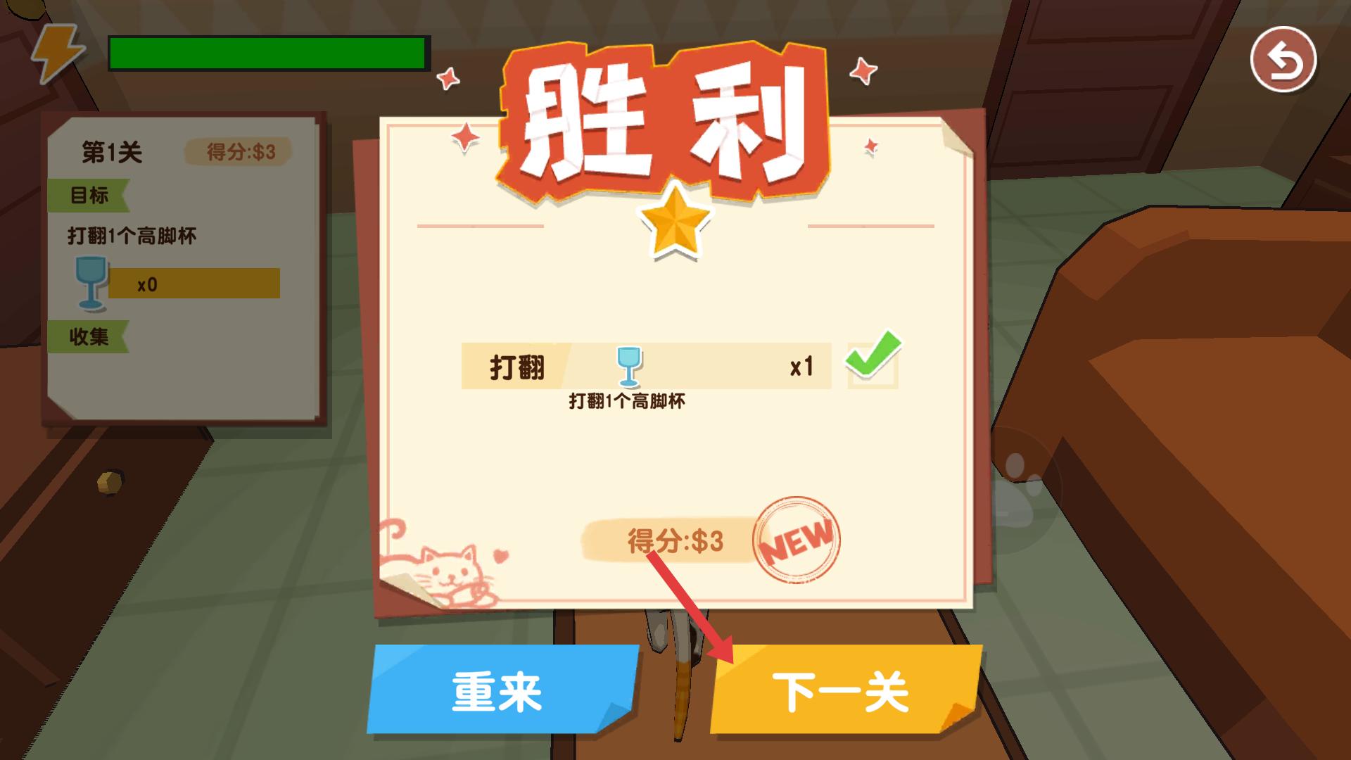 4、成功打翻高腳杯后,出現(xiàn)勝利界面,可查看得分與完成目標(biāo)情況,點(diǎn)擊下一關(guān)繼續(xù)挑戰(zhàn)新破壞任務(wù),開啟更多關(guān)卡冒險(xiǎn)。