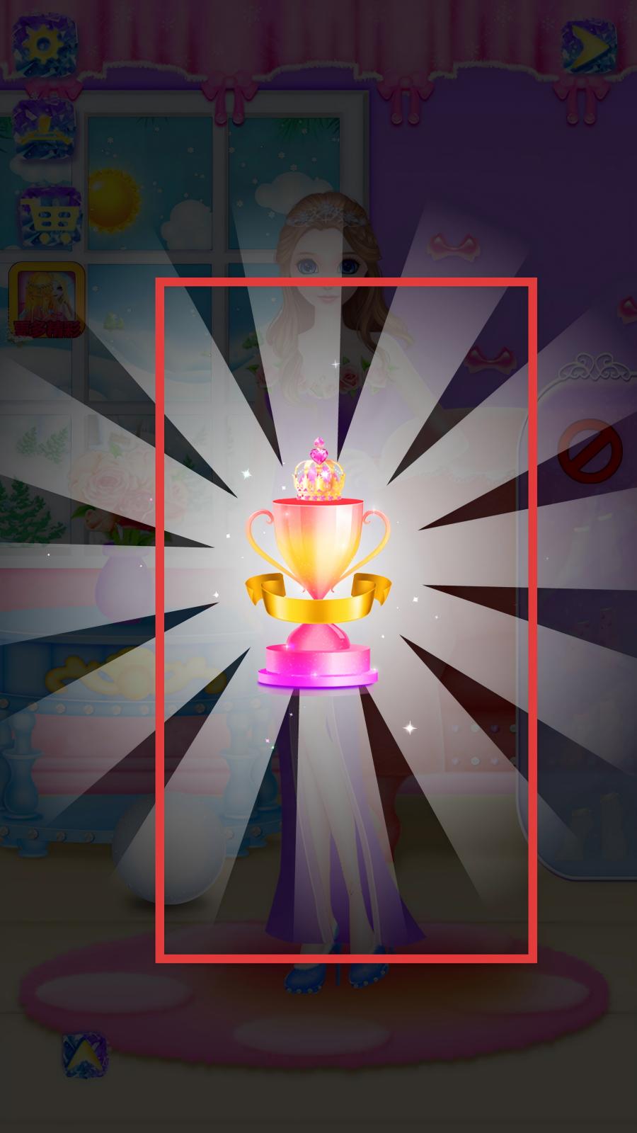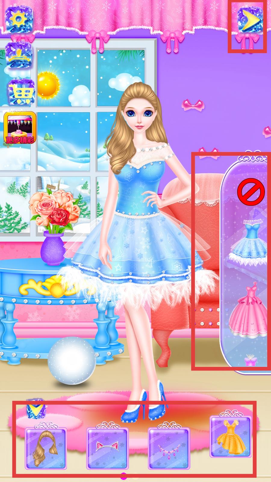3、操作時點擊底部配飾欄物品,為公主更換對應(yīng)裝飾,點擊右側(cè)服裝欄裙子切換公主穿搭,按喜好搭配發(fā)型、頭飾、項鏈、裙子,完成公主裝扮,使形象契合場景主題。