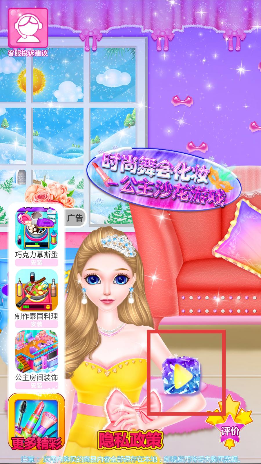 1、打開時尚舞會化妝進入初始界面,界面展示公主形象,點擊人物旁鉆石按鈕,進入場景選擇頁面,頁面呈現(xiàn)多個裝飾場景。