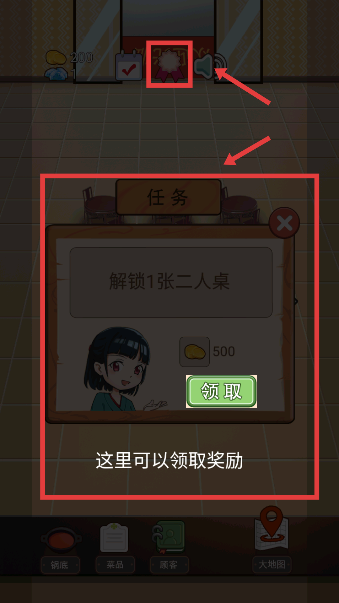 4、添加桌子后,點(diǎn)擊頂部任務(wù)勛章圖標(biāo),彈出任務(wù)界面,界面展示解鎖1張二人桌等任務(wù),完成任務(wù)后點(diǎn)擊領(lǐng)取按鈕,獲取金幣等獎勵。