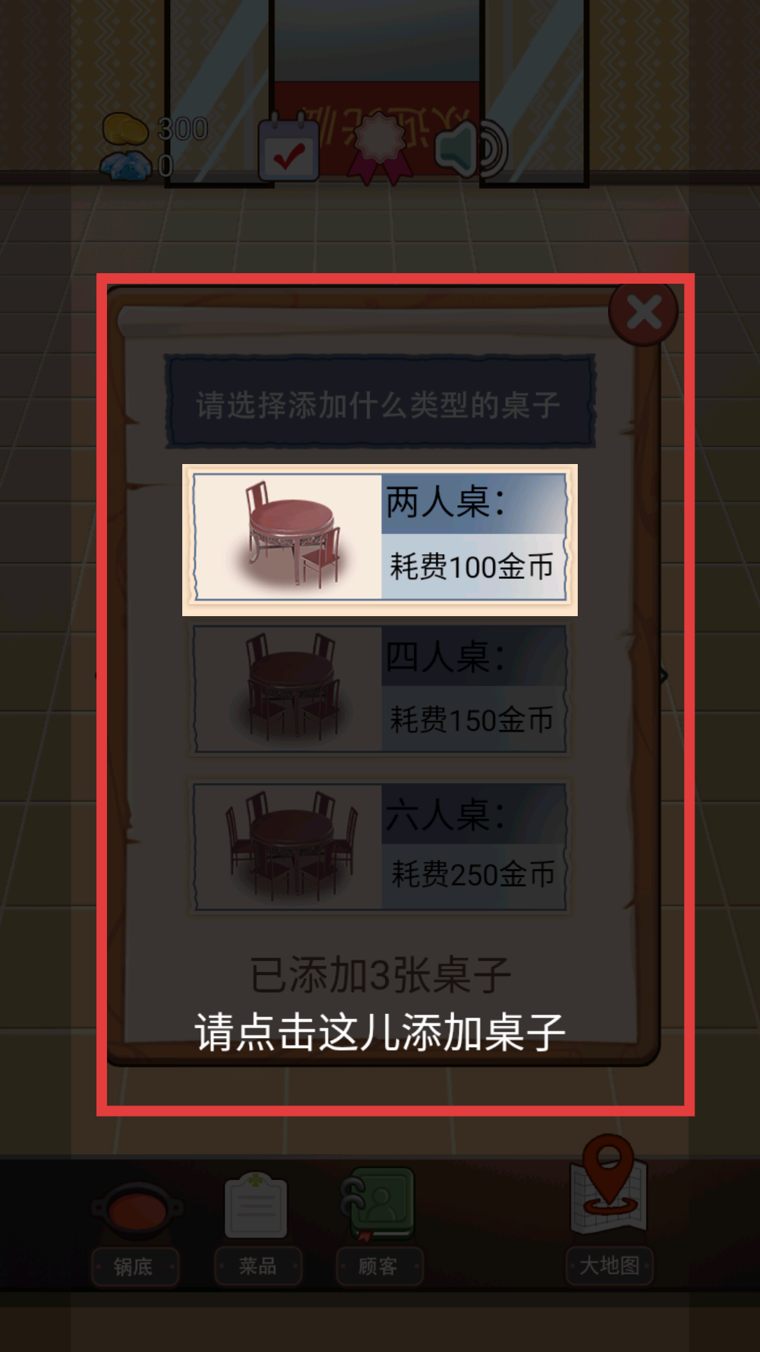 3、在桌子類型選擇界面,顯示兩人桌、四人桌、六人桌選項(xiàng),可依據(jù)金幣數(shù)量及經(jīng)營需求,點(diǎn)擊對應(yīng)桌子類型完成添加,界面同步顯示已添加桌子數(shù)量。