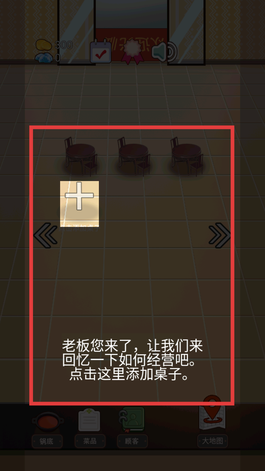 2、進(jìn)入店鋪場景后,界面呈現(xiàn)火鍋店內(nèi)部空間,有桌椅擺放區(qū)域,底部顯示鍋底、菜品等功能欄,根據(jù)提示點(diǎn)擊這里添加桌子,點(diǎn)擊對應(yīng)區(qū)域的加號標(biāo)識。
