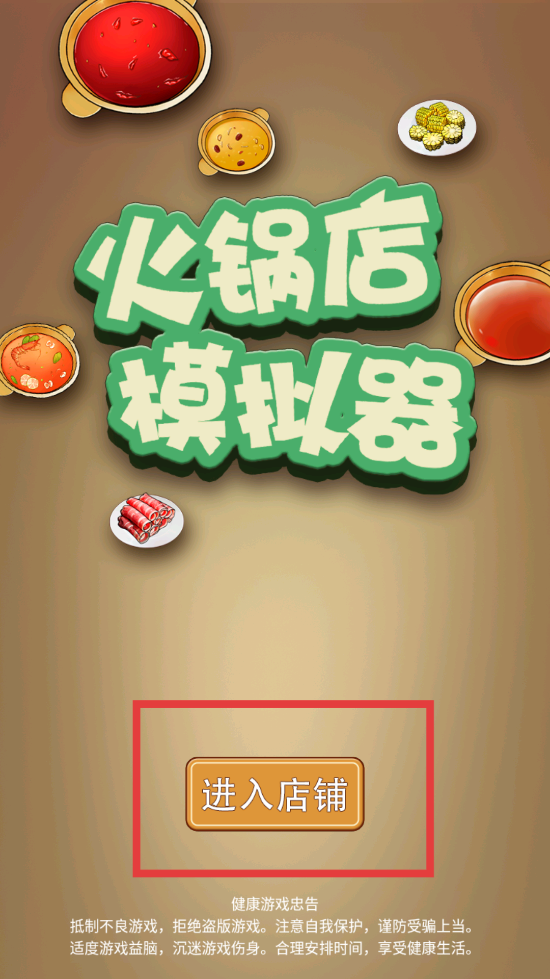 1、打開火鍋店模擬器進(jìn)入初始界面,界面展示火鍋店模擬器標(biāo)題及鍋底、菜品等火鍋元素,點(diǎn)擊下方進(jìn)入店鋪按鈕,加載進(jìn)入火鍋店經(jīng)營場景。