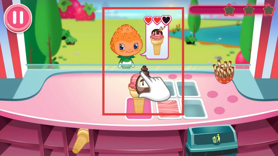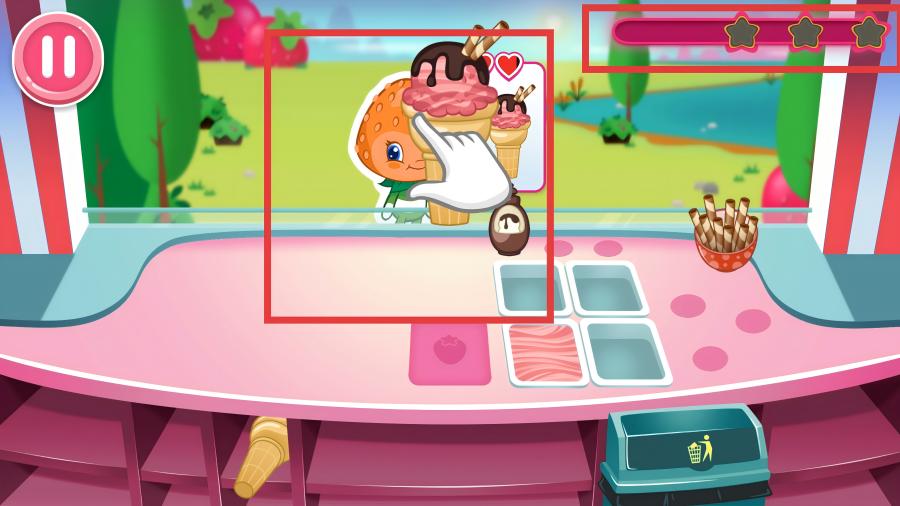 3、加好巧克力醬后,按照界面提示,把做好的冰淇淋遞給草莓形象的顧客,顧客拿到冰淇淋后,界面右上角的星星評分條開始變化,顯示出當前評分進度。