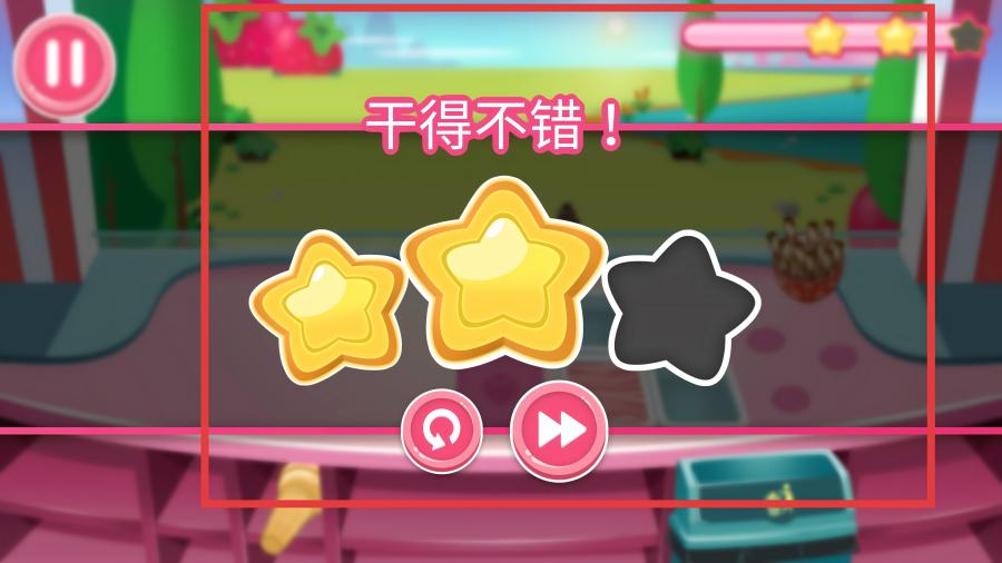 4、顧客拿到冰淇淋后,界面彈出干得不錯的提示,還展示出星星評分結(jié)果,下方有重新開始和下一關(guān)的按鈕,點擊下一關(guān)按鈕,就能繼續(xù)游戲流程。