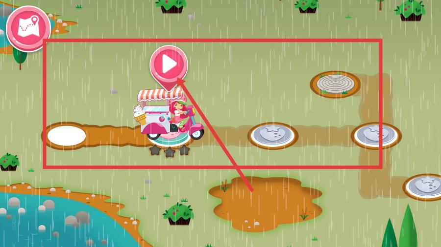 1、打開一起來做冰淇淋進入帶有雨天場景的地圖界面,界面里停著一輛粉色冰淇淋車,冰淇淋車上方有個圓形播放按鈕,接著點擊這個圓形播放按鈕,進入冰淇淋制作關(guān)卡。