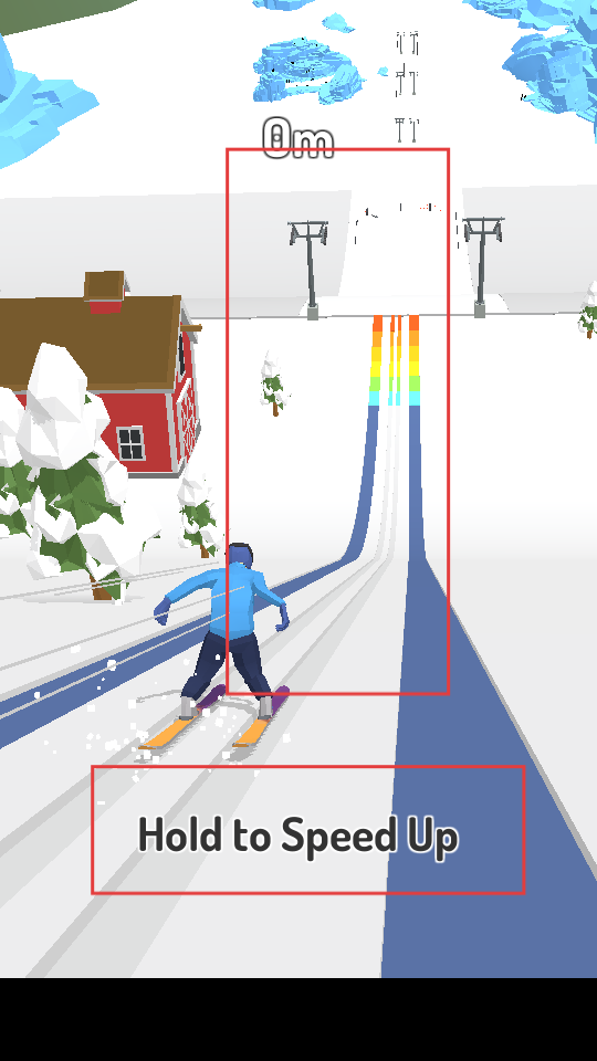 2、在滑雪過程中長按屏幕可加速,借助彩虹滑道等場景,助力滑行,嘗試滑得更遠(yuǎn)。