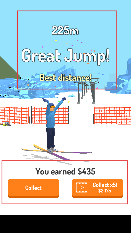 4、完成滑雪后,根據(jù)滑行距離等獲得獎勵,可點(diǎn)擊Collect領(lǐng)取金幣,也能看視頻獲取更多金幣,用于后續(xù)升級。