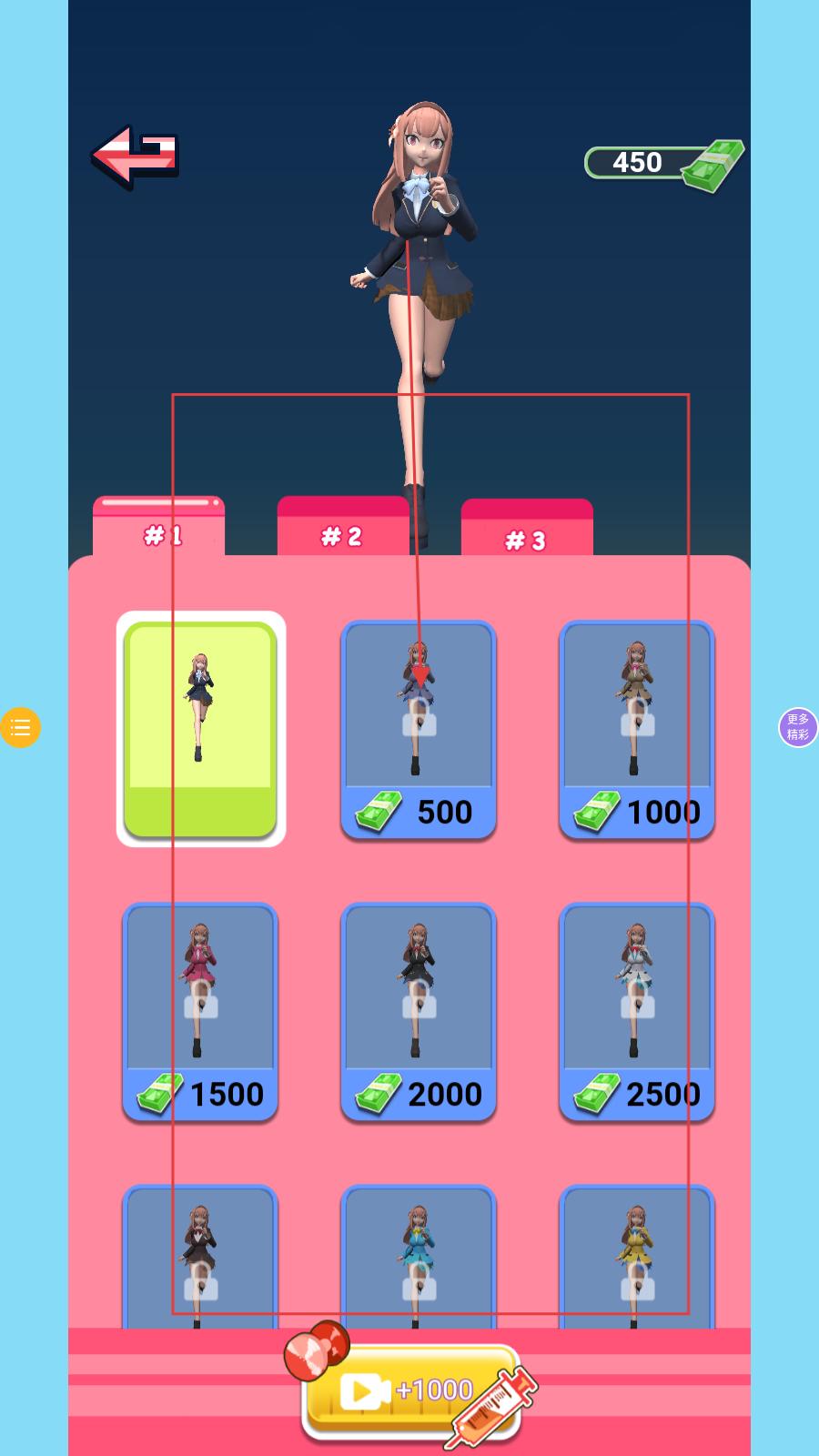 1、在游戲初始可選擇不同裝扮的角色,解鎖角色需要相應(yīng)數(shù)量的金錢,如500、1000等,根據(jù)擁有的金錢選擇解鎖。