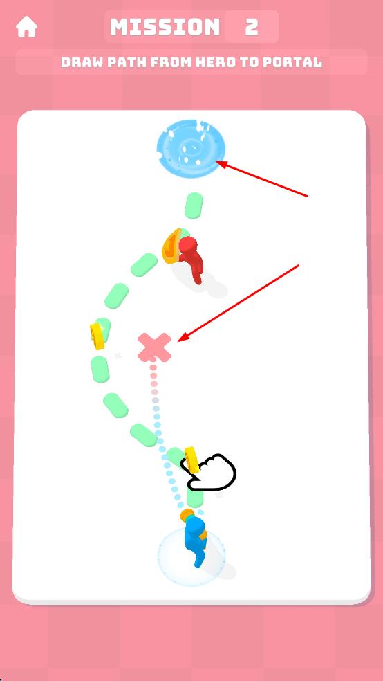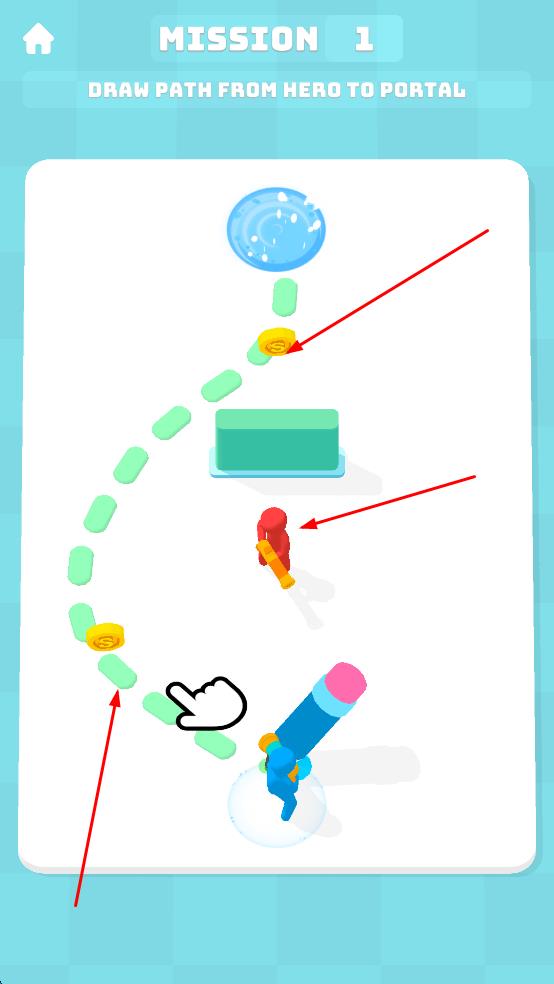 2、任務(wù)時(shí),長按屏幕繪制路徑,引導(dǎo)角色沿綠色節(jié)點(diǎn)移動(dòng),沿途收集金幣,避開水池旁敵人,順利抵達(dá)傳送門。