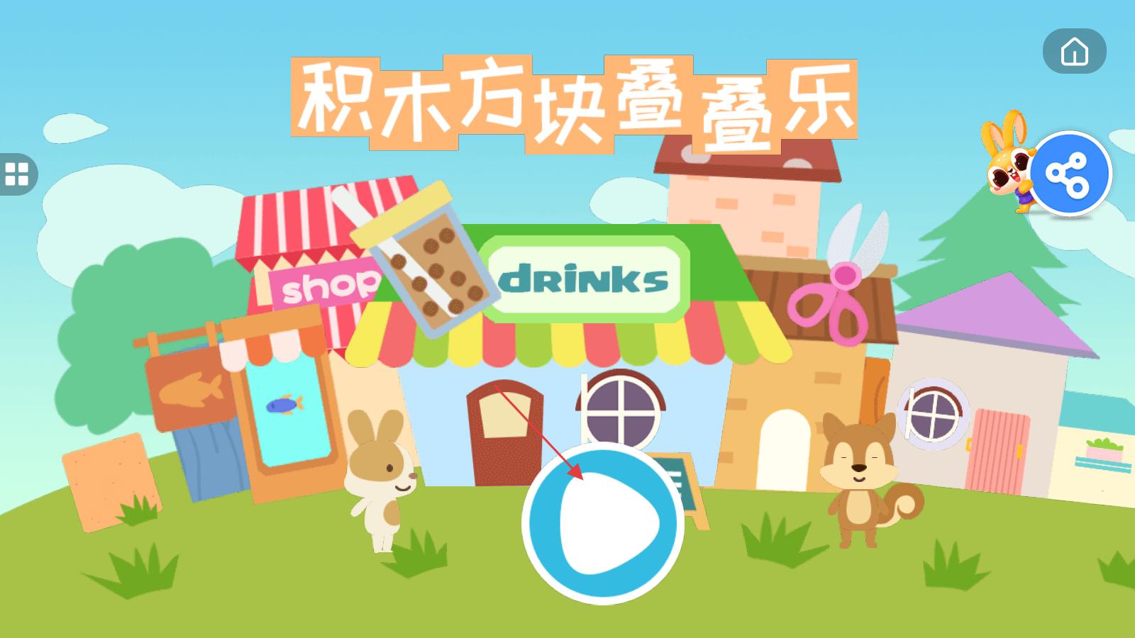 1、打開積木方塊疊疊樂,進入游戲主界面,界面有可愛的卡通場景和開始按鈕,點擊開始按鈕,進入游戲關(guān)卡。