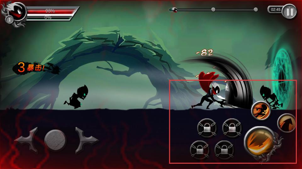 2、進(jìn)入關(guān)卡后,操控角色在場(chǎng)景中移動(dòng),遇到敵人時(shí),點(diǎn)擊攻擊按鈕,釋放技能打擊敵人,推進(jìn)關(guān)卡進(jìn)程。