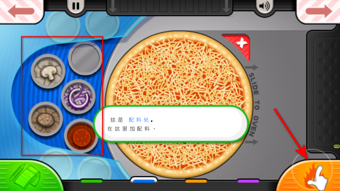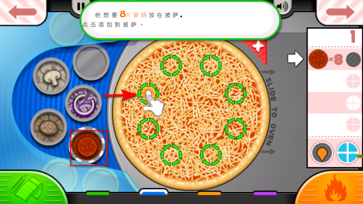 4、按照顧客要求,比如添加指定數(shù)量的香腸,點擊配料并放置到披薩對應(yīng)的位置,完成配料添加后,可進行下一步制作。