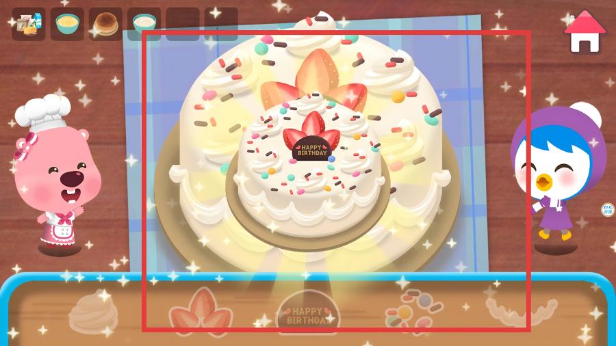 4、烤箱內的食材烘焙完成后,進入蛋糕裝飾界面,界面中有烘焙好的蛋糕胚,還有奶油、草莓、彩色糖屑等裝飾材料,使用這些裝飾材料對蛋糕胚進行裝飾。