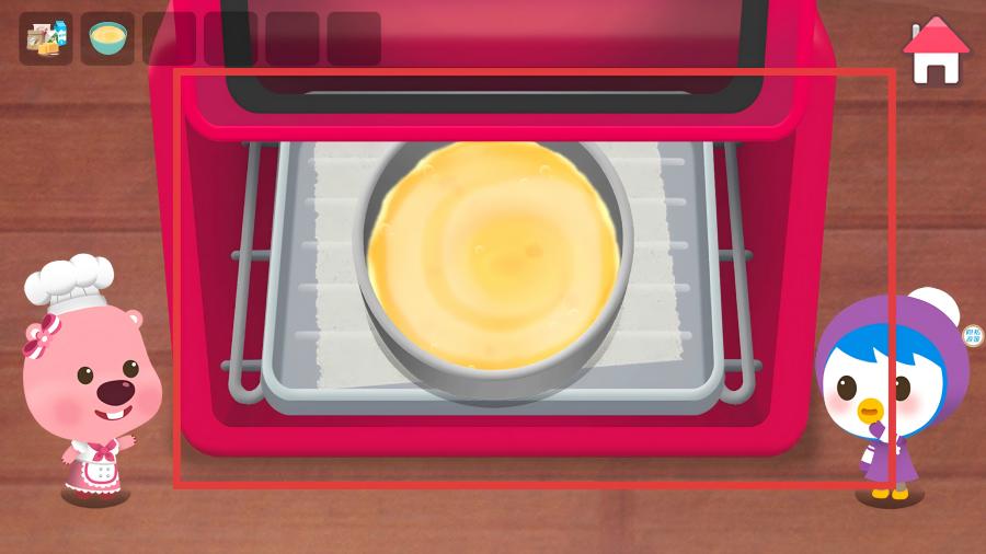 3、食材攪拌均勻后,進入烘焙界面,界面中有紅色的烤箱,將攪拌好的食材倒入模具中,放入烤箱進行烘焙,等待烘焙完成,期間可查看烤箱內食材的變化情況。