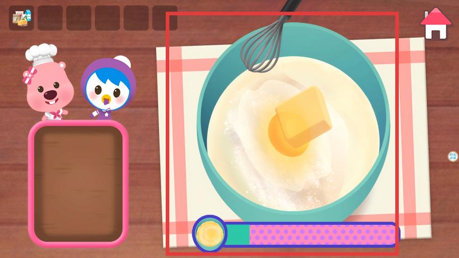 2、選取好制作蛋糕所需的食材后,進入食材攪拌界面,界面中有裝有面粉、雞蛋、黃油等食材的容器,還有攪拌器,按照游戲流程,使用攪拌器對容器內的食材進行攪拌。