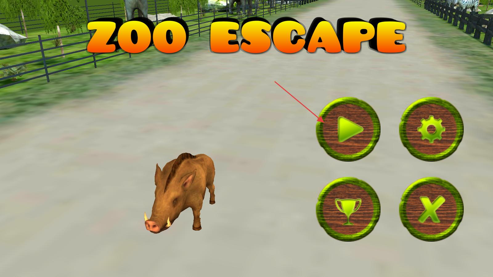 1、進(jìn)入動(dòng)物園逃生,界面上有野豬形象和幾個(gè)圓形按鈕,點(diǎn)擊帶有綠色三角形的按鈕,開(kāi)始游戲進(jìn)程。
