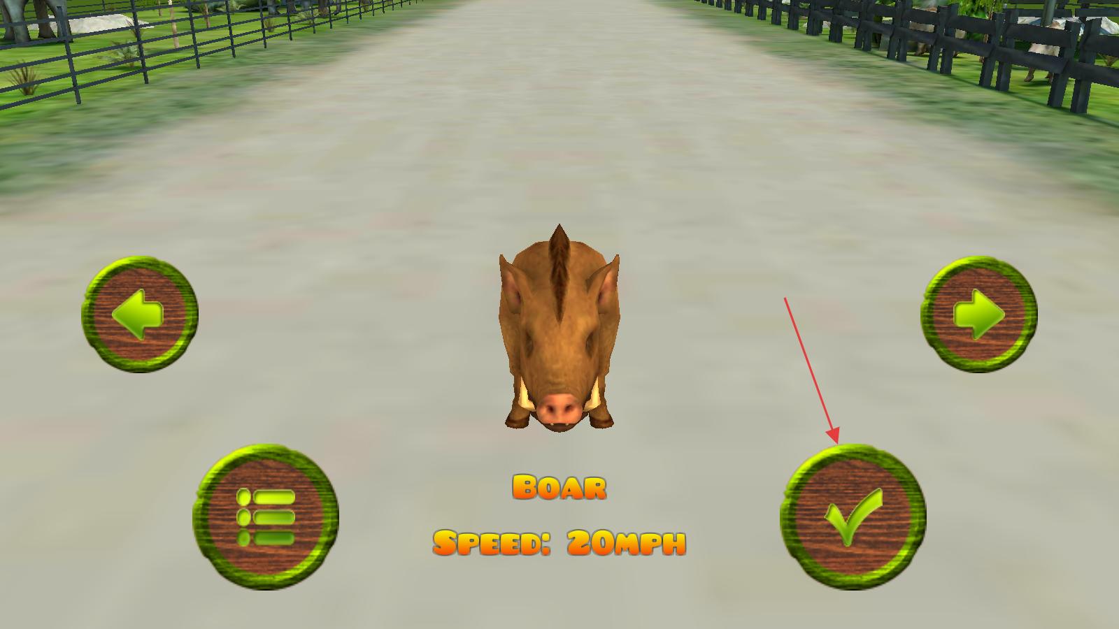 2、進(jìn)入角色選擇或確認(rèn)界面,能看到野豬形象以及相關(guān)速度等信息,點(diǎn)擊帶有綠色對(duì)勾的按鈕,確定選擇并進(jìn)入游戲場(chǎng)景。