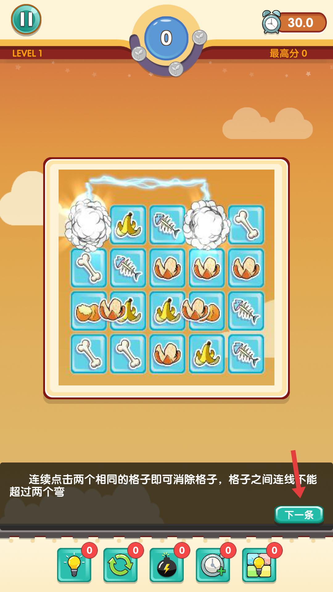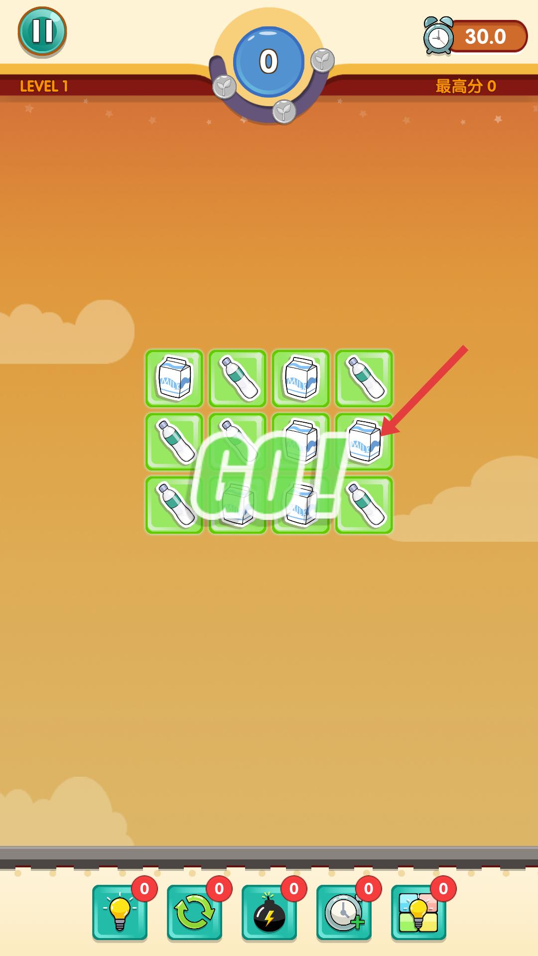 2、進(jìn)入第一關(guān),看到牛奶盒、水瓶等圖標(biāo),需快速尋找相同的圖標(biāo),準(zhǔn)備進(jìn)行連連看操作,在30秒內(nèi)盡可能多地消除圖標(biāo)得分。