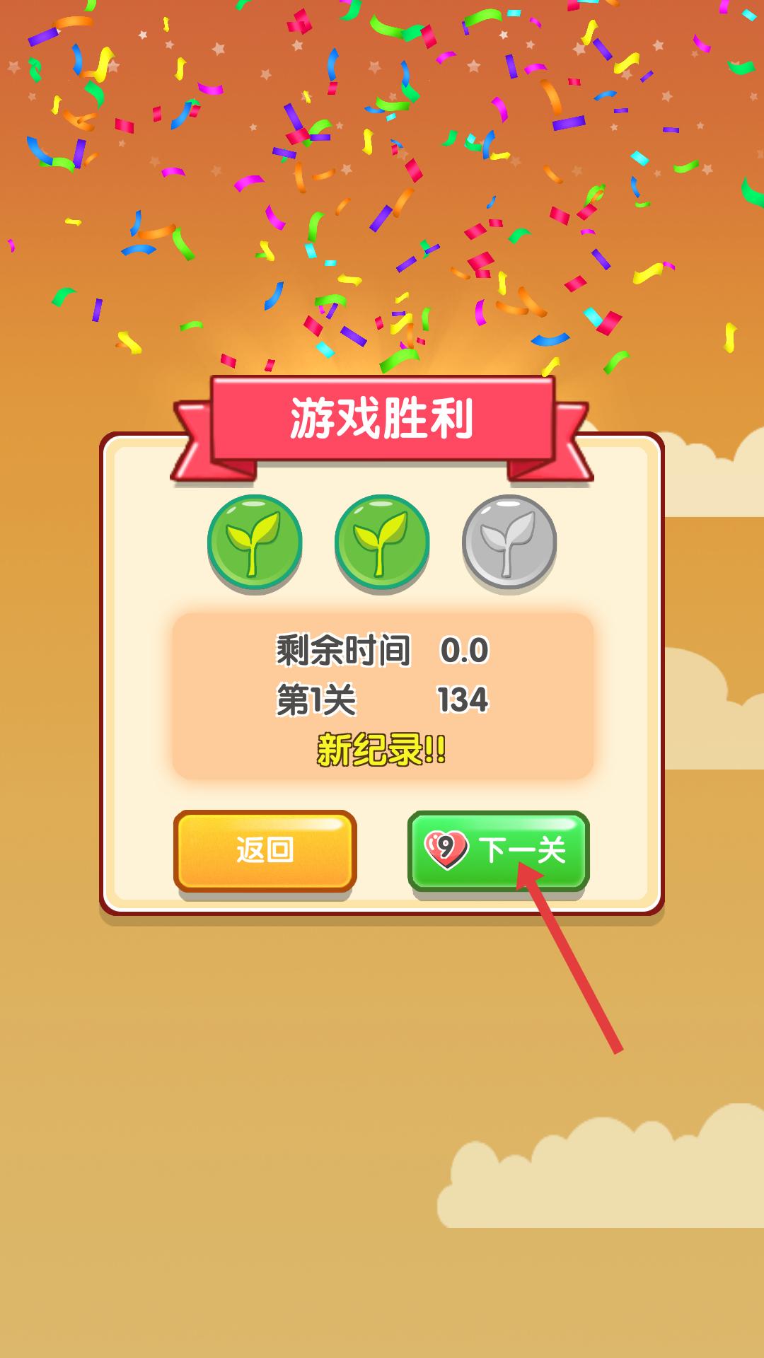 4、成功通關(guān)第一關(guān)后,界面顯示游戲勝利,此時點擊綠色下一關(guān)按鈕,繼續(xù)挑戰(zhàn)下一關(guān),爭取獲得更好的成績和獎勵。