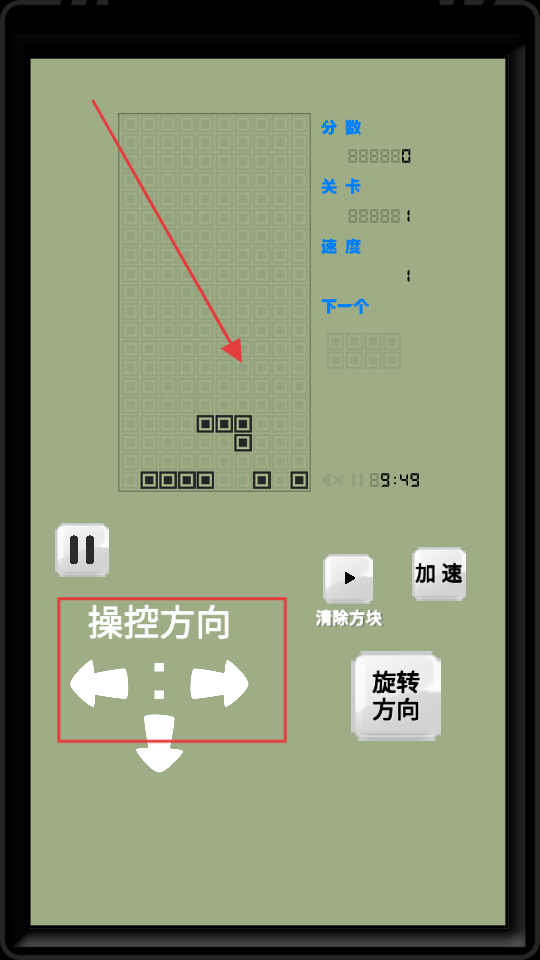 3、利用操控方向按鈕,控制方塊左右移動以及加速下落,將方塊放置到合適位置,當一行方塊被填滿時,該行會被消除,獲得分數(shù)。