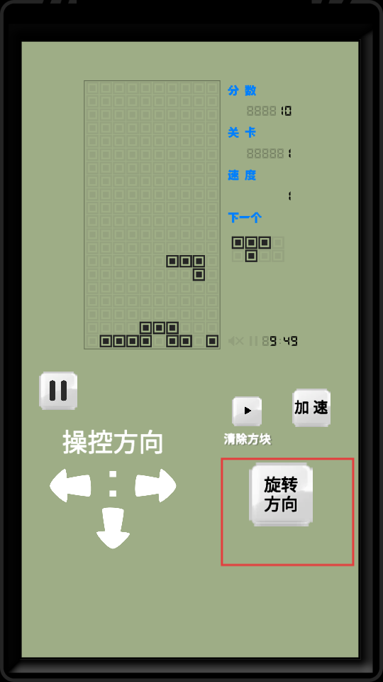 4、游戲過程中點擊旋轉(zhuǎn)方向按鈕,改變下落方塊的形狀和方向,使其能夠更好地與下方已有的方塊契合,為消除行做準備。
