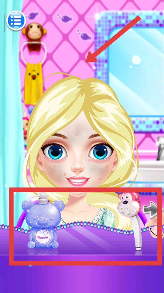 3、選擇公主角色后進(jìn)入護(hù)理界面,利用屏幕下方或界面中的道具,為公主進(jìn)行臉部清潔、頭發(fā)護(hù)理等前期準(zhǔn)備工作。