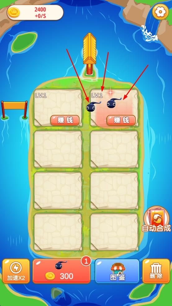 2、在已放置的LV1生物格子點(diǎn)擊賺錢獲取收益,合理規(guī)劃生物擺放位置,提升金幣獲取效率。