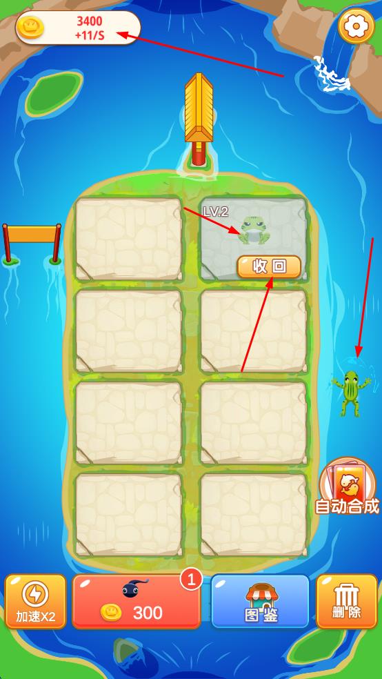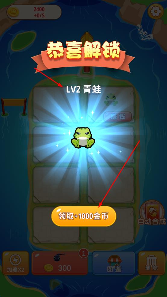 3、將相同等級(jí)生物相鄰放置,合成解鎖更高等級(jí)如LV2青蛙,點(diǎn)擊領(lǐng)取獎(jiǎng)勵(lì)金幣,加速發(fā)展進(jìn)度。