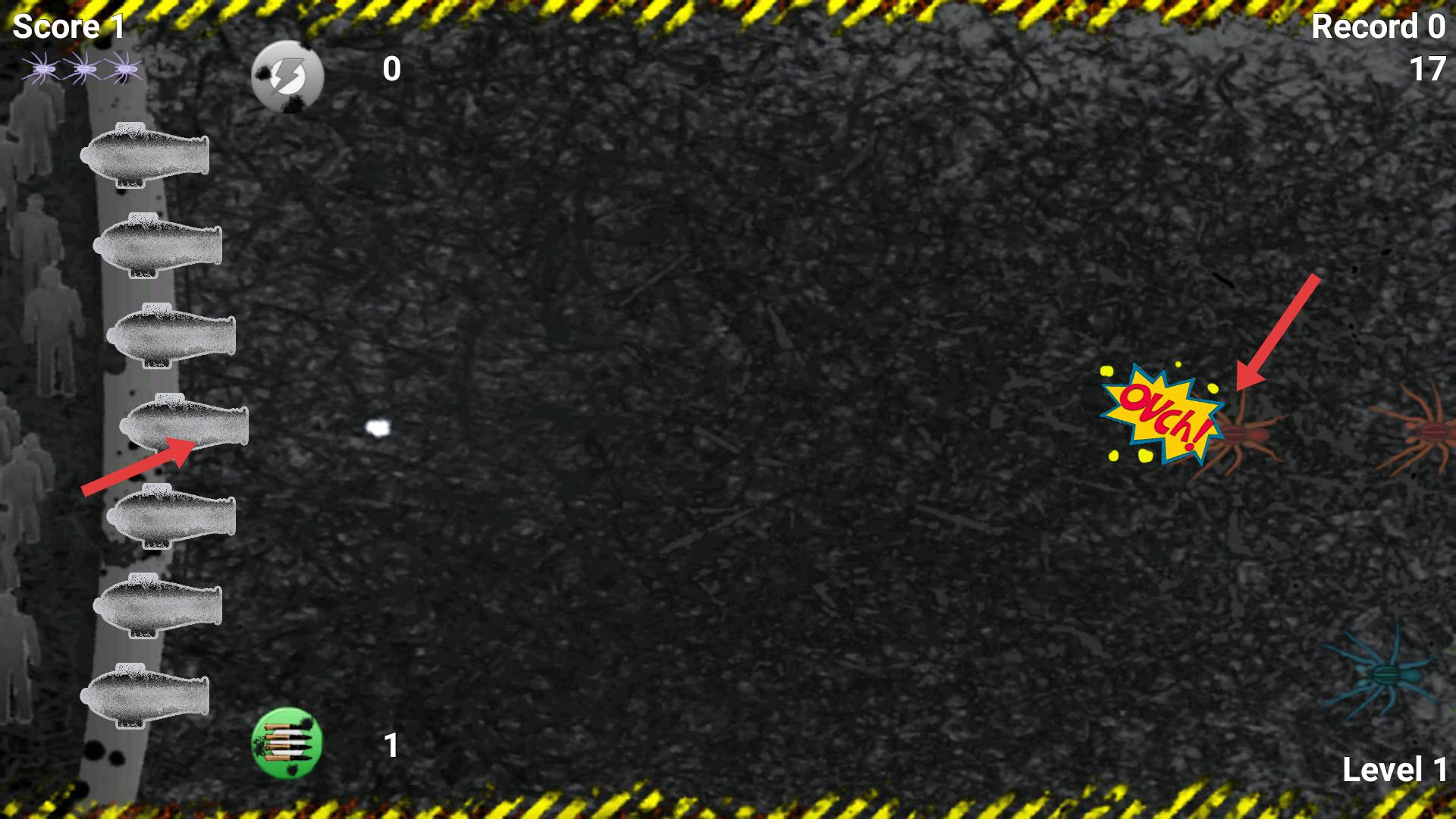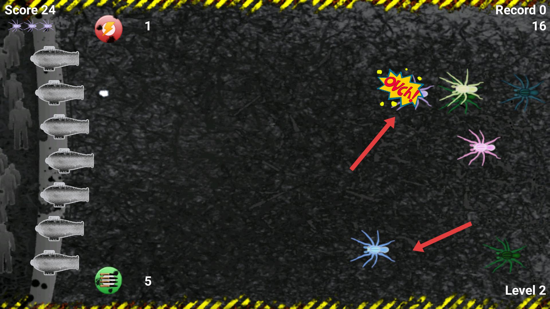 2、進(jìn)入游戲后,左側(cè)有炮彈,右側(cè)會出現(xiàn)蜘蛛,要操控炮彈發(fā)射,擊中蜘蛛,避免蜘蛛靠近,同時留意得分和關(guān)卡信息。