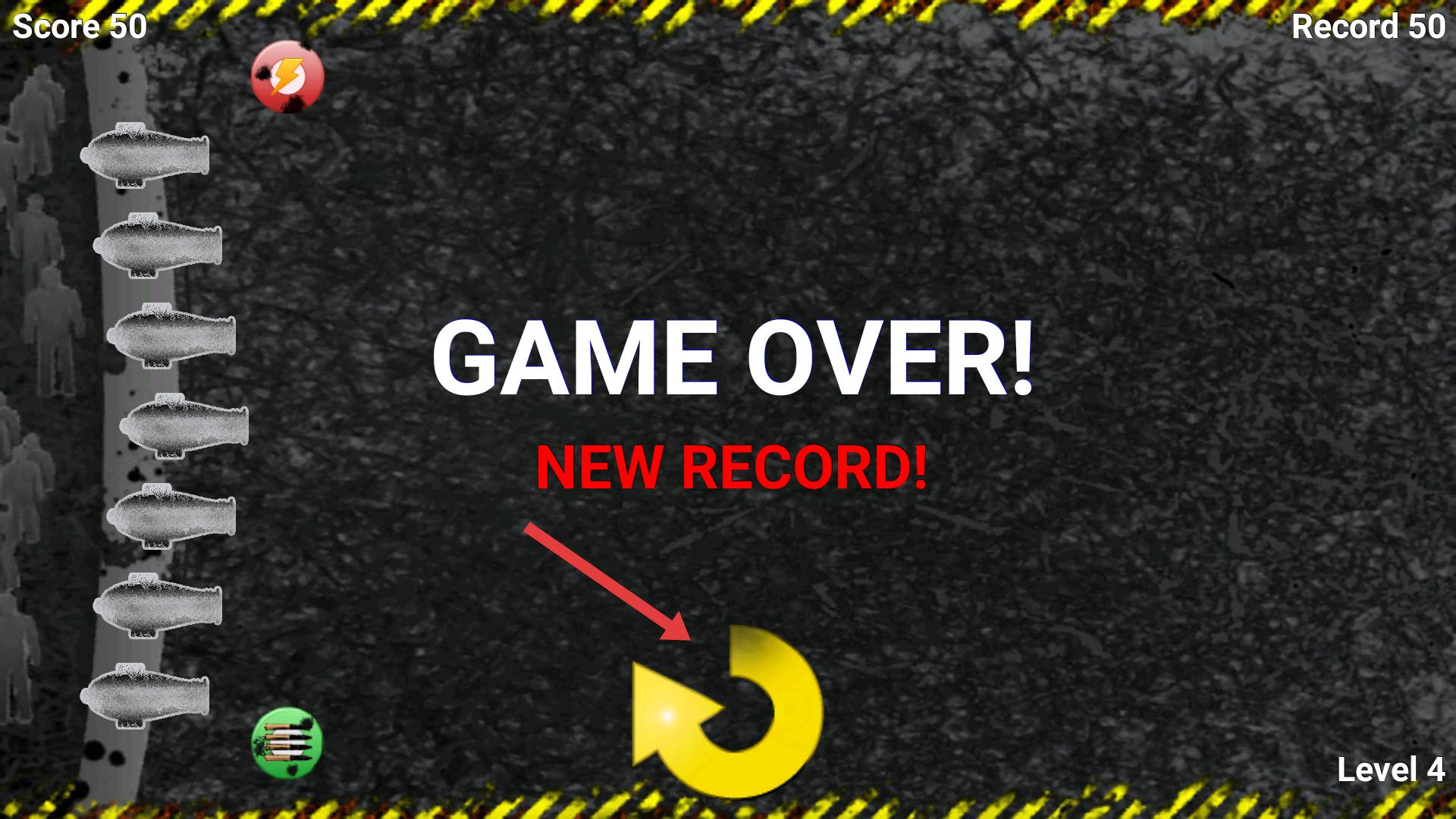 4、游戲結(jié)束后,若創(chuàng)了新紀(jì)錄,會顯示NEW RECORD,點(diǎn)擊重玩箭頭,可重新開始游戲,再次挑戰(zhàn)獲取更高分?jǐn)?shù)。