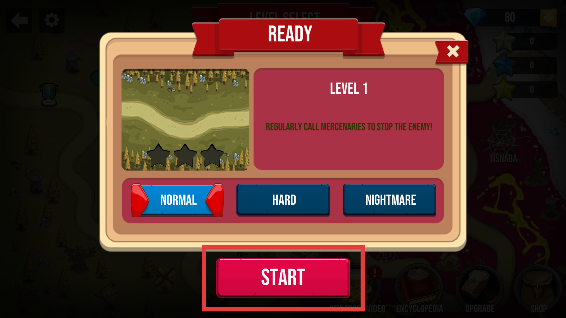 3、在關(guān)卡難度選擇界面,有三種難度選項(xiàng),還有關(guān)卡相關(guān)的提示文字,點(diǎn)擊START按鈕,進(jìn)入游戲戰(zhàn)斗界面。