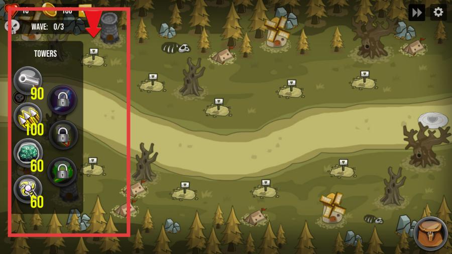 4、進(jìn)入游戲戰(zhàn)斗界面后,界面左側(cè)有TOWERS板塊,展示了可建造的防御塔及其所需金幣數(shù)量,可根據(jù)金幣數(shù)量選擇建造相應(yīng)的防御塔來(lái)抵御敵人進(jìn)攻。