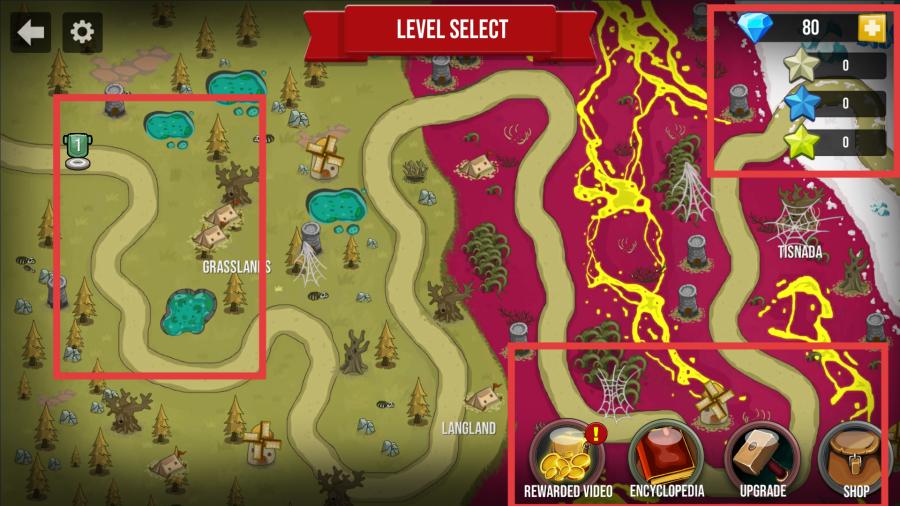 2、在關(guān)卡選擇界面,展示了不同的關(guān)卡地圖,還有鉆石數(shù)量、星星數(shù)量等信息以及功能按鈕,點(diǎn)擊標(biāo)有1的關(guān)卡區(qū)域,進(jìn)入關(guān)卡難度選擇界面。