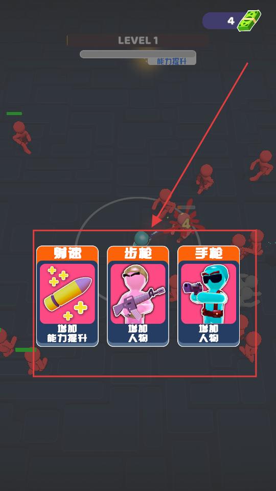 3、在游戲過程中會(huì)出現(xiàn)提升能力的選擇界面,可選擇射速、步槍、手槍等不同的提升選項(xiàng),選擇后能增強(qiáng)角色的戰(zhàn)斗能力,更順利地應(yīng)對后續(xù)的紅色小人敵人。
